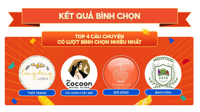 Câu chuyện của 4 thương hiệu gồm Lengdeng.collect (Thời trang), Cocoon Vietnam (Sức khỏe & Sắc đẹp), Chàng Sứ (Đời sống) và Medifood.io (Bách hóa) ghi dấu ấn với người bình chọn nhờ thể hiện rõ rệt tình yêu với các sản vật, nguyên liệu và trang phục biểu tượng sản sinh trên chính dải đất hình chữ S - Ảnh: Shopee